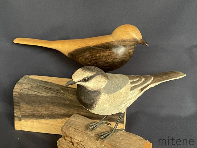 手前はハクセキレイのリアルカービングです。チュペロ材を用い、細いビットで羽まで彫り入れ、アクリル絵具で彩色しました。